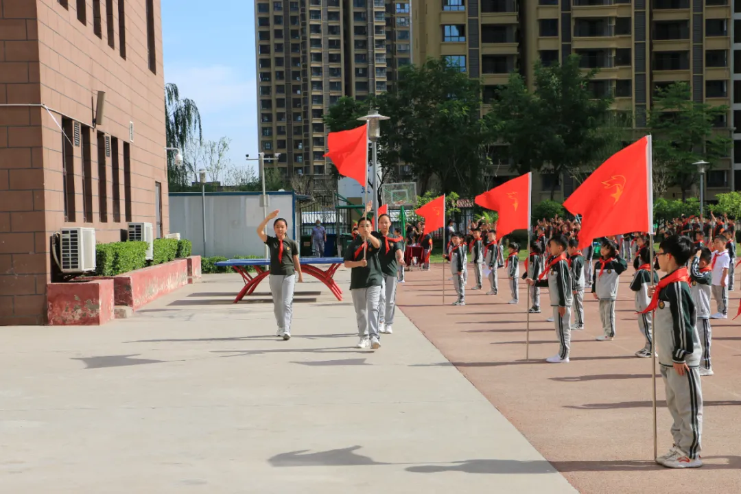 大队辅导员为新队长授中队旗,八个新中队加入了少先队的大家庭。