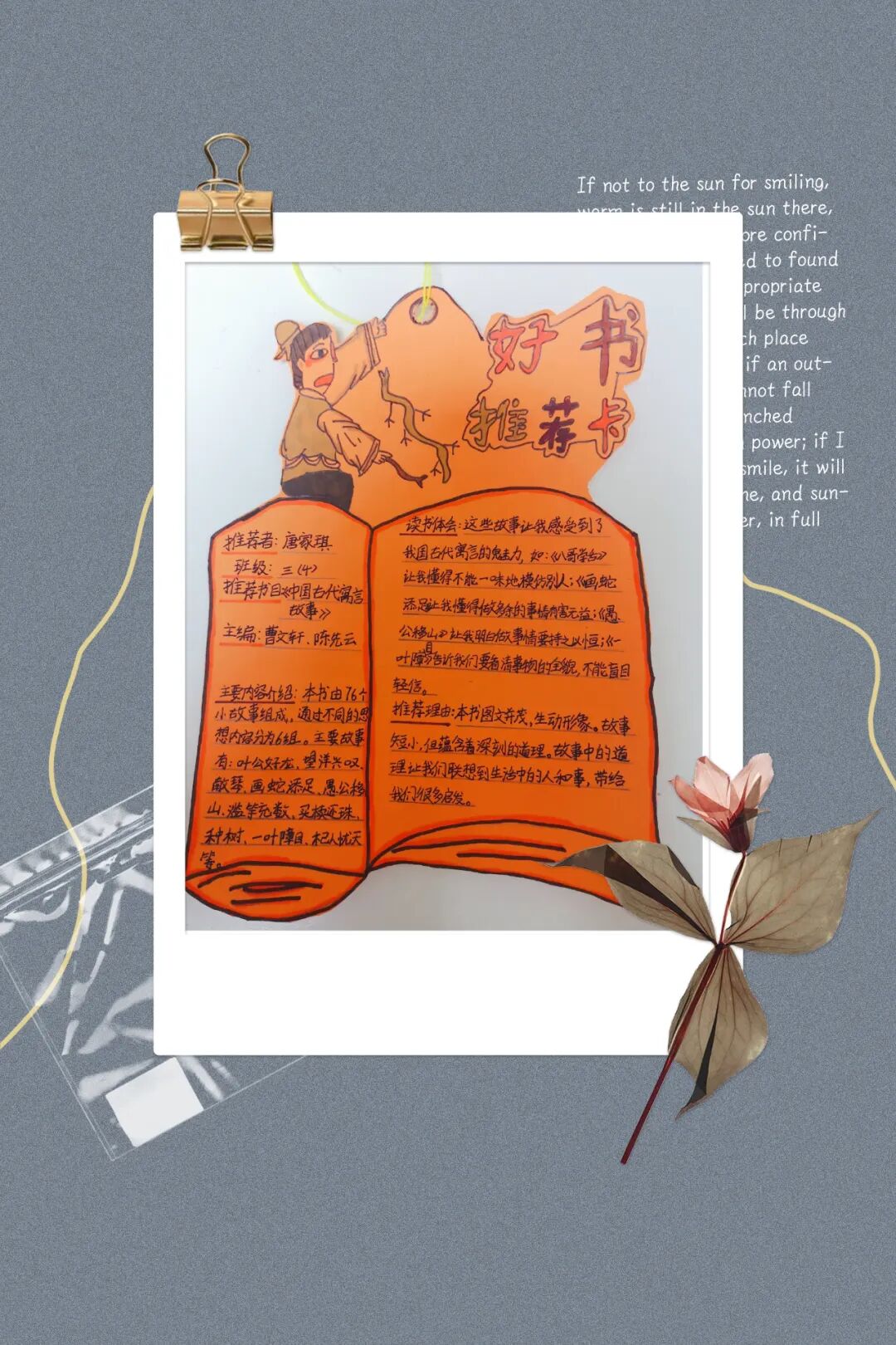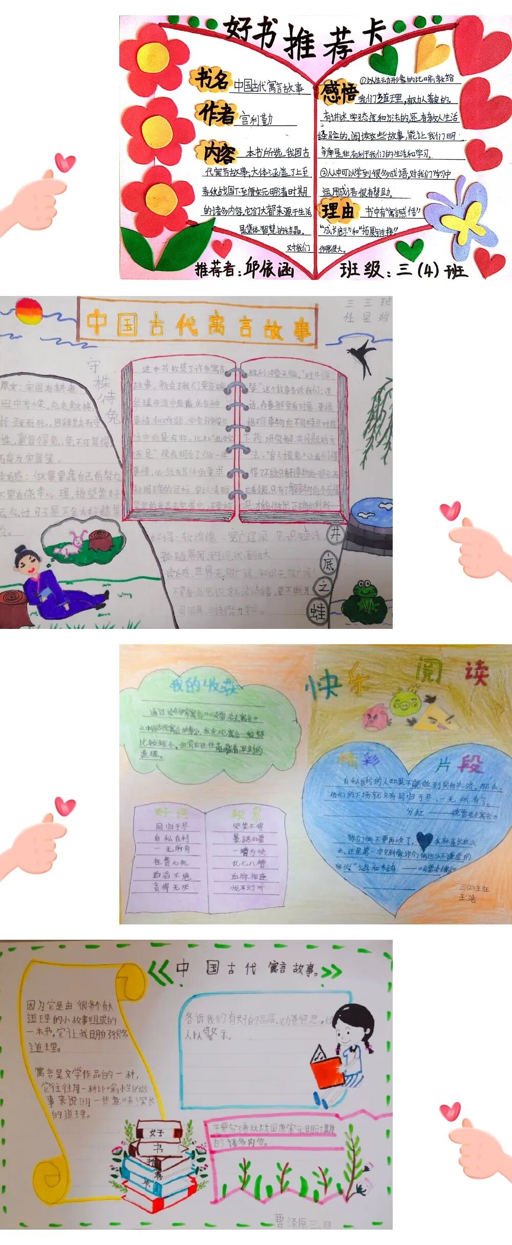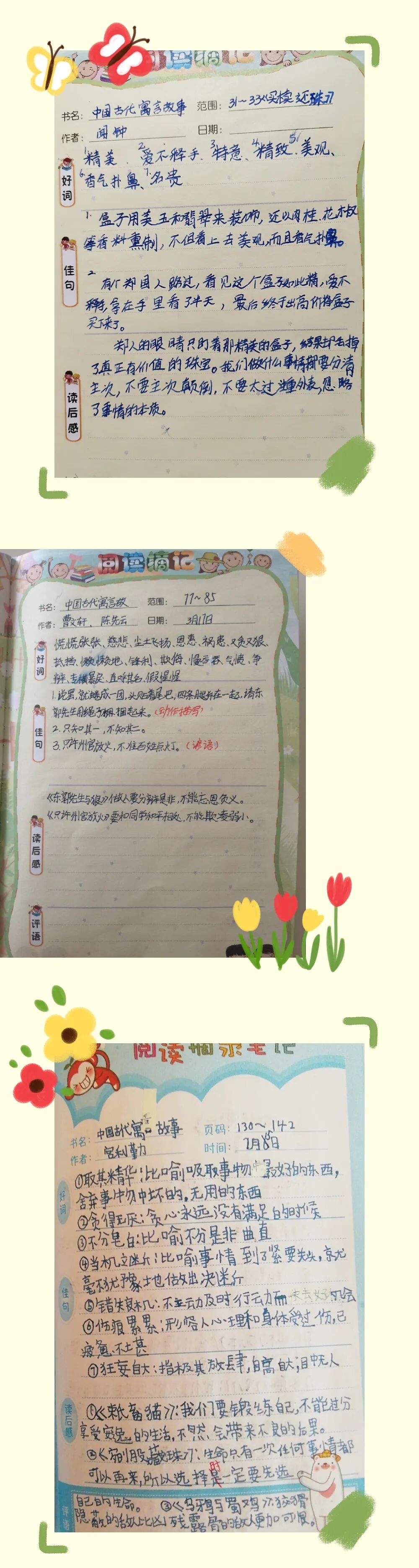 小寓言,大魔袋 ——西安经开六小三年级语文“寓言大王争霸赛” 作者:admin 发布于:2020/3/25 11:43:10 浏览:1114【次】 “寓言是一个怪物,当它朝你走来的时候,分明是一个故事,生动活泼,而当它转身要走的时候,却突然变成了一个严肃认真的哲理老人;寓言是一面镜子,它照出来的可能是你,可能是他,更可能是我自己。”特殊的学习时光,让我们继续与经开六小三年级的孩子们畅游斑斓而睿智的寓言世界中,品味书香,启迪智慧吧! 《中国古代寓言》凝结着中华民族的智慧,这些寓言题材广泛,形式活泼,读起来轻松有趣,蕴含着诸多人生道理。下面就让我们跟随以下三位同学一起走进《中国古代寓言故事》吧! ● ● ● 三年级一班周雨诗讲《楚人学齐语》 ● ● ● 三年级二班成子墨讲《自相矛盾》 ● ● ● 三年级四班唐家棋讲《一叶障目》 寓言像睿智的达者,启迪人的智慧;像幽默的哲人,明辨人的思想;像明媚的阳光,给人温暖的力量。宅家学习的日子里,孩子们走进寓言,为大家呈现了一张张精美的推荐小报、读书推荐卡、阅读记录等,真是小寓言,大世界。 有趣的寓言故事比赛,不仅锻炼了孩子们的表达能力,激发了他们阅读的兴趣,还让同学们感受到阅读带来的幸福和成长。本次“寓言大王争霸赛”获奖名单揭晓啦: 愿孩子们继续与经典同行,绘人生的底色。在寓言故事中汲取营养,在书香世界中滋润灵魂。 - END - 撰稿:付文娟 审核:卢婉筠